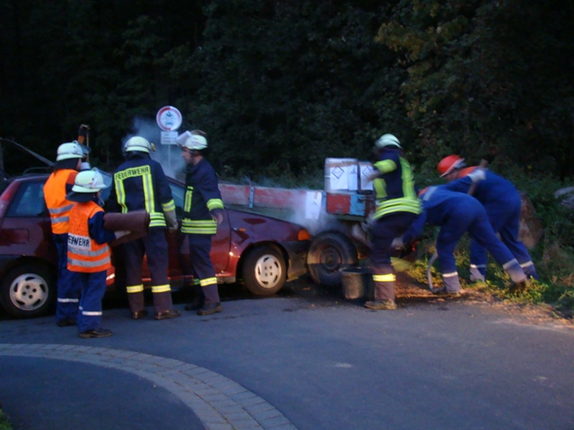 Die zweite Einsatzgruppe, die Besatzung des MTW kümmerte sich um das Traktorgespann. Auf dem Anhänger standen zwei Fässer aus denen Flüssigkeit auslief, anhand der Beschilderung erkannte man, dass es sich um Flüssig-Dünger handelt, der für die Umwelt gefährlich ist. Die Fässer wurden abgedichtet und der ausgelaufene Dünger mit Bindemittel aufgenommen.